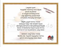 Tidak banyak yang dapat (bapak/ ibu) berikan untukmu nak. Di hari lahir kamu ini harapan saya adalah kamu akan tumbuh menjadi insan yang cerdas dan berguna bagi keluarga dan bangsa.Mama harap senyum diwajahmu itu tidak akan pernah memudar. Tahukah kamu bahwa kamulah penyemangat hidup mama, dengan adanya dirimu membuat mama selalu bersemangat menjalani kehidupan ini, kelak mama harap kamu akan menjadi orang yang berguna. Rajinlah belajar nak, dan teruslah berjuang untuk masa depanmu yang masih panjang. Mama disini selalu mendukungmu